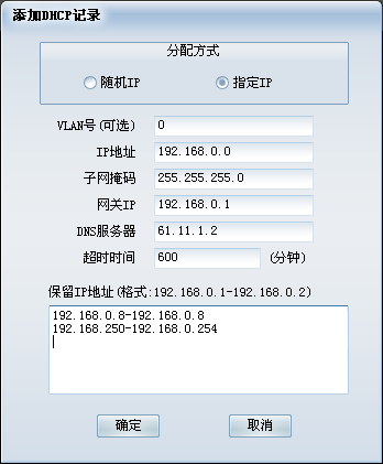 点击主菜单“高级功能设置”->DHCP服务设置,弹出如下窗口: